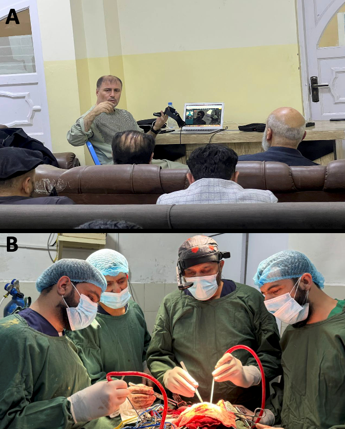 Figure 1: The “A” shows Dr. Jaweed, an Afghan neurosurgeon, providing training to fellow neurosurgeons in Afghanistan with Ohana One glasses. The “B” depicts Dr. Zamriduddin Khalid, a neurosurgeon based in Afghanistan, using Ohana One glasses during surgery.